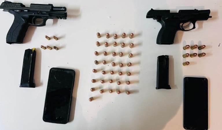 Durante el control, los agentes detuvieron la marcha de un Renault Logan blanco conducido por un chofer de la aplicación. Tras una breve entrevista, avanzaron con la requisa de los pasajeros y revisaron la mochila que transportaban, donde encontraron dos pistolas —una Taurus calibre 9 mm y una Bersa Mini Thunder calibre .45— ambas con la numeración limada, además de municiones y teléfonos celulares.