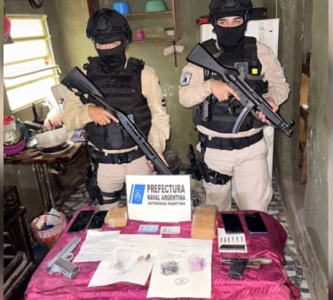 Un allanamiento realizado por efectivos de la Prefectura Naval Argentina en una vivienda de Capitán Bermúdez concluyó con la detención de dos personas y el secuestro de estupefacientes, armas de fuego y otros elementos vinculados a una causa por robo calificado.