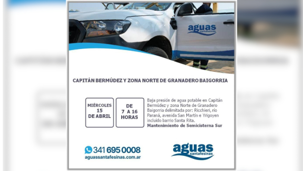 La empresa Aguas Santafesinas anunció que este miércoles 15 de abril llevará adelante trabajos de mantenimiento en la infraestructura de Capitán Bermúdez, lo que podría impactar en el suministro de agua potable en la región.